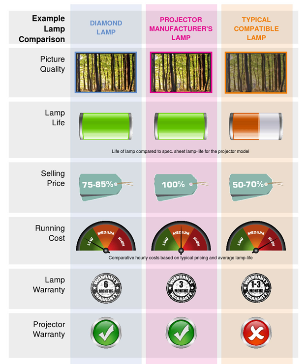 - Экономия средств, т.к. цена на ламповые модули TM DIAMOND ниже, чем на оригинальныеTM OM!
